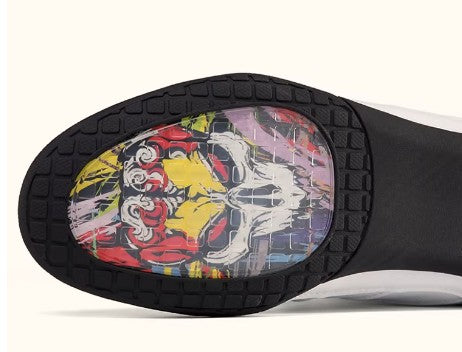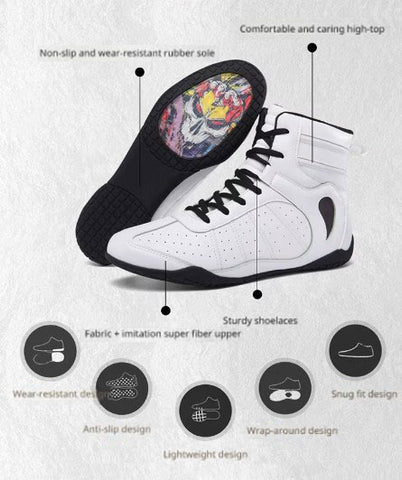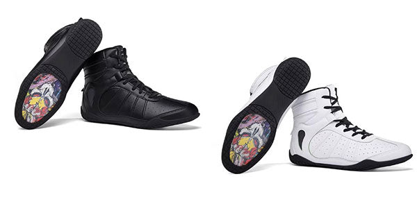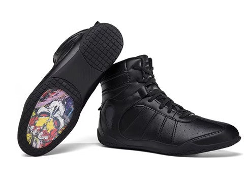 These boxing shoes made with microfiber feature a durable yet lightweight design, with a distinctive graphic print on the insole, available in black and green colors. They are marketed as unisex training footwear with features such as breathable mesh uppers, non-slip rubber soles for excellent grip and traction, and ankle support.