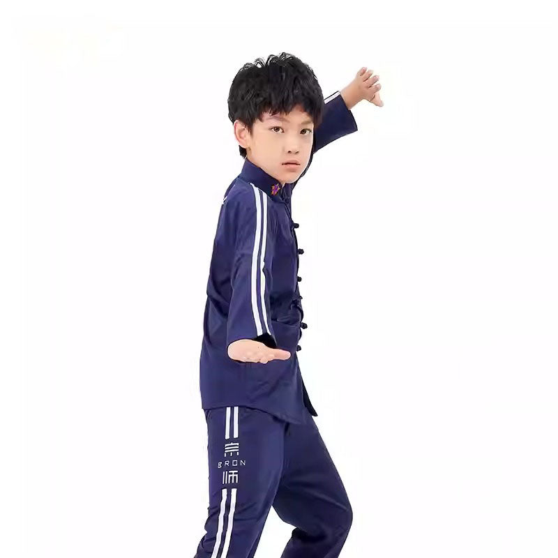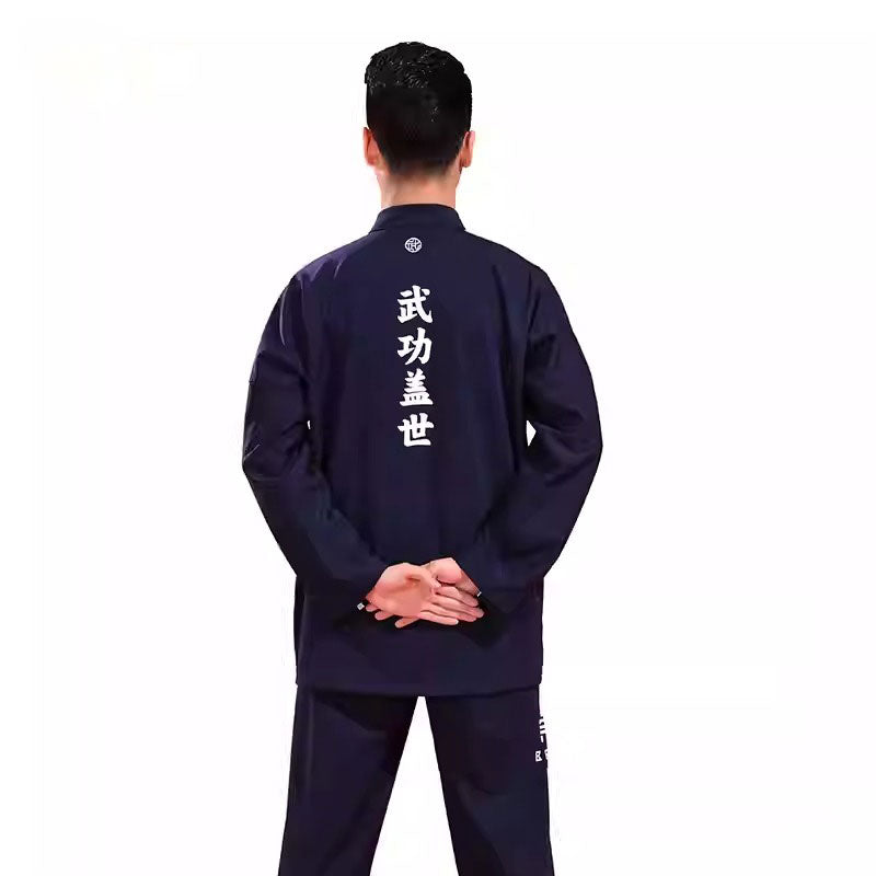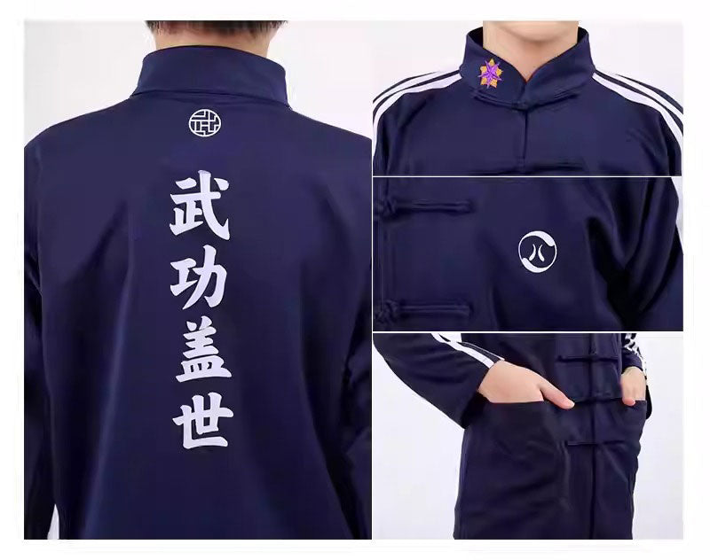 These outfits consist of a loose-fitting jacket with a mandarin collar and frog button closures, screen print Chinese characters "Unparalleled martial arts skills" at the back paired with matching pants that often feature side stripes.