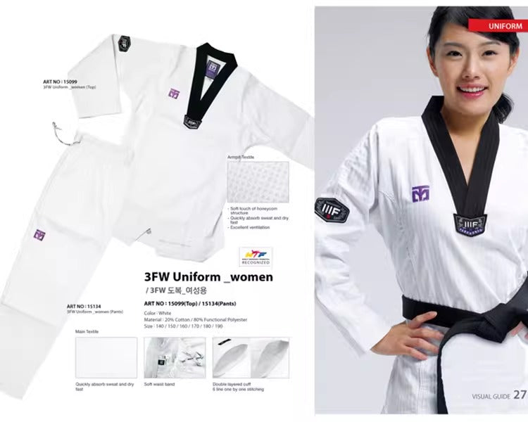 A premium "dobok" specifically designed with a slim, fashion-forward cut for female practitioners. This World Taekwondo (WT) recognized uniform features a specialized ergonomic 3D pattern to enhance mobility while maintaining a tailored fit around the waist
