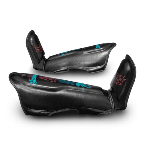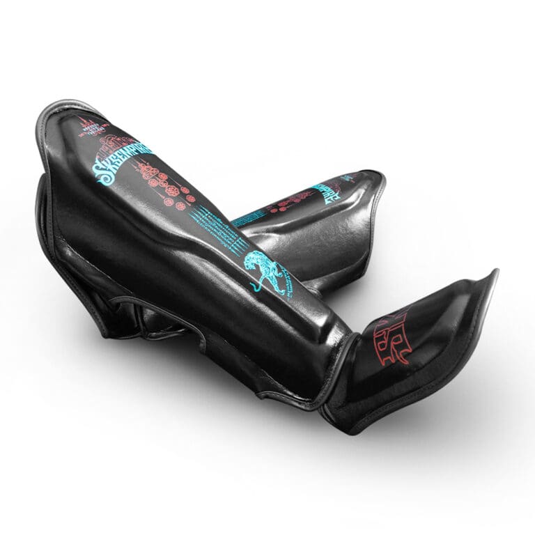 The Tiger Bomb design, inspired by the traditional double tiger Thai Yant, symbolizes strength and protection. With bold blue and magenta detailing, these shin guards bring a modern edge to a powerful Muay Thai symbol—helping you stand out while staying protected.