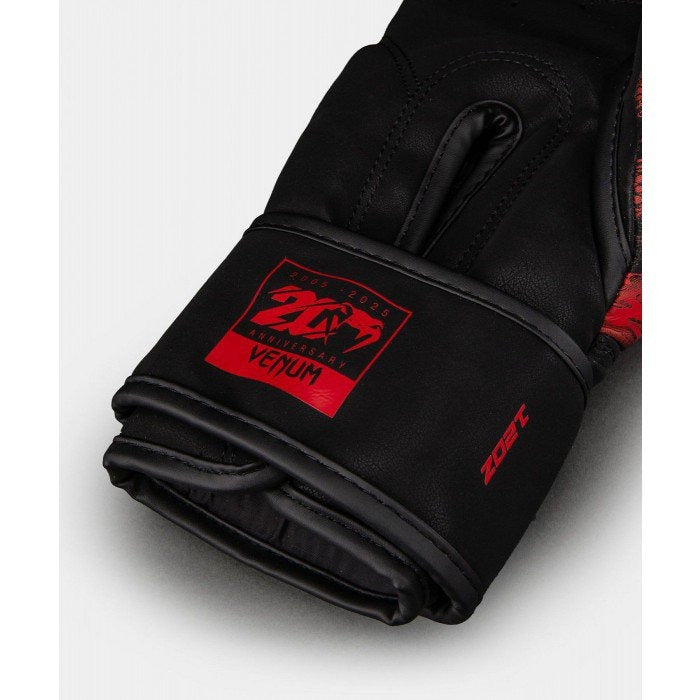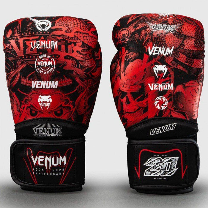 The Venum 20th Anniversary Boxing Gloves honor two decades of Venum. The design incorporates graphics from our bestselling collections. These gloves offer solid protection and durability. Made with triple-density foam they deliver excellent impact absorption with every strike. The gloves' ergonomic design, adjustable hook-and-loop wrist strap and elongated cuffs deliver a secure, natural feeling fit. Comfortable and reliable, ideal for regular usage. Suitable for boxing, kickboxing and Muay Thai, with regular use (3-4 times per week).