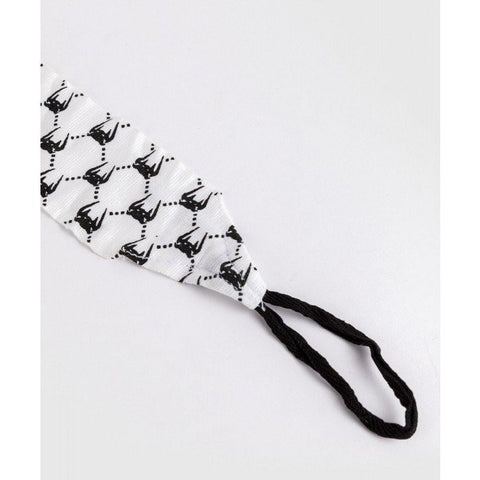 The white and black colorway features a repeated sublimated Venum logo along the wrap, with a branded patch at the closure. Suitable for boxing, Muay Thai, MMA and other combat sports.