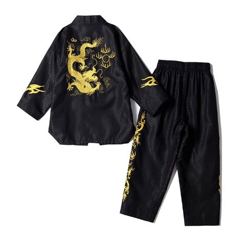 • Design: The uniform features a V-neck jacket with striking gold dragon embroidery on the chest, sleeves, and legs of the pants. The black V-neck collar signifies a black belt (Dan grade) practitioner.