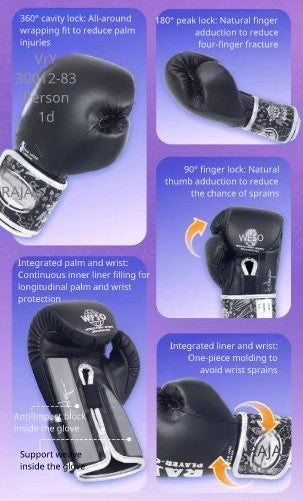 These RAJA C200S Muay Thai gloves design fpr 360 degree all round protection, mutilple layers made with premium quality material, Sponge+SBR+Latex. There is a generous amount of 4.5 cm thick padding across the knuckles to help absorb impact from striking, and across the back of the hand to help block kicks. Latex Air Sac uses a specific padding system for shock absorption make them durable and long lasting. Break these gloves in and they will withstand endless training sessions.
