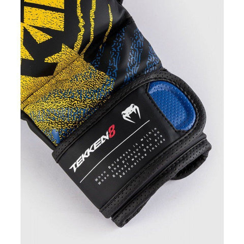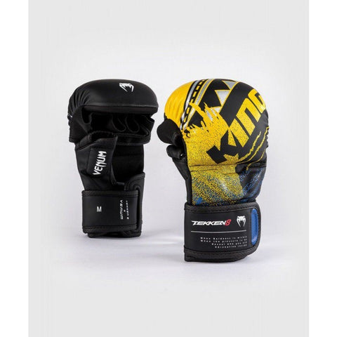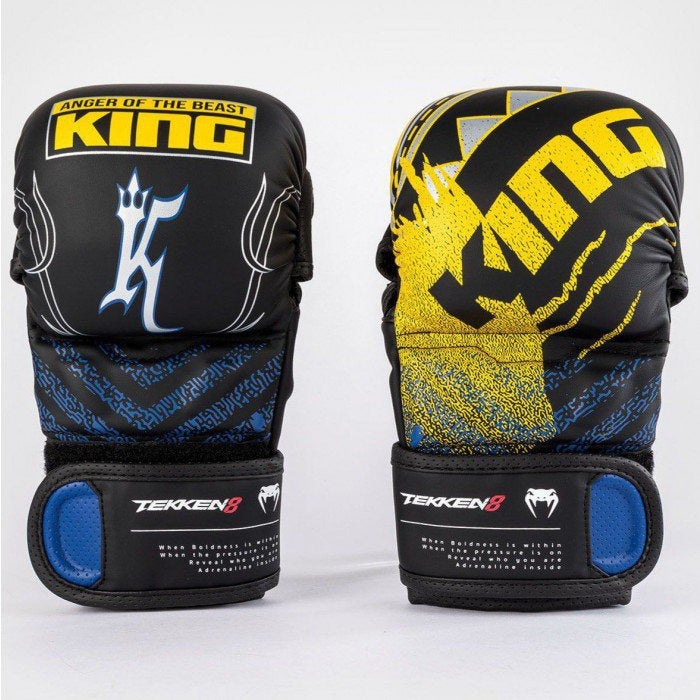“Fist Meets Fate”: VENUM x TEKKEN 8 is a range of authentic combat sports gear and apparel created in conjunction with TEKKEN 8, the latest chapter in the tragic saga of the Mishima bloodline and its world-shaking father-and-son grudge matches. Through this striking collection, gamers and athletes alike can channel fan-favorite characters, including Kazuya Mishima, King and Yoshimitsu. The VENUM x TEKKEN 8 MMA Sparring Gloves - King reflect King's pro-wrestler identity through the signature blue, yellow, and black color scheme and bold patch-style graphics, similar to those on his wrestling gear. The crown and jaguar motifs directly reference his mask and